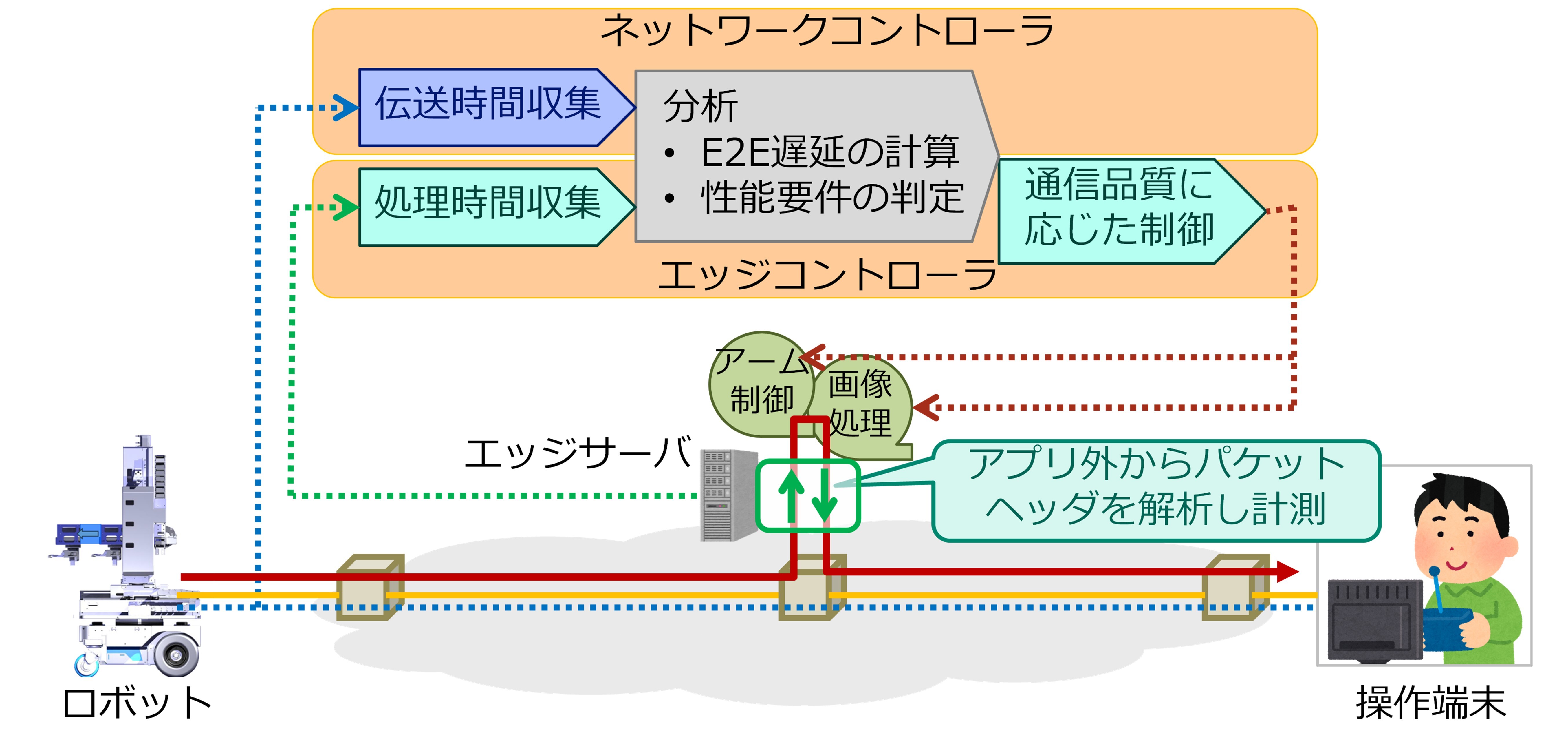 ネットワークコンピュート高速クローズドループ制御技術は、エッジサーバでの処理時間とネットワークの遅延時間をリアルタイムに状態把握し、エンドツーエンドの遅延時間を計算して通信品質の判定を行います。通信品質が性能要件を満たさなくなると、別の経路や別のサーバでの処理に即座に切り替えることで、安定した低遅延サービスを提供する技術です。この技術を高度化し、ロボットの操作性を改善するための機能を追加しました。