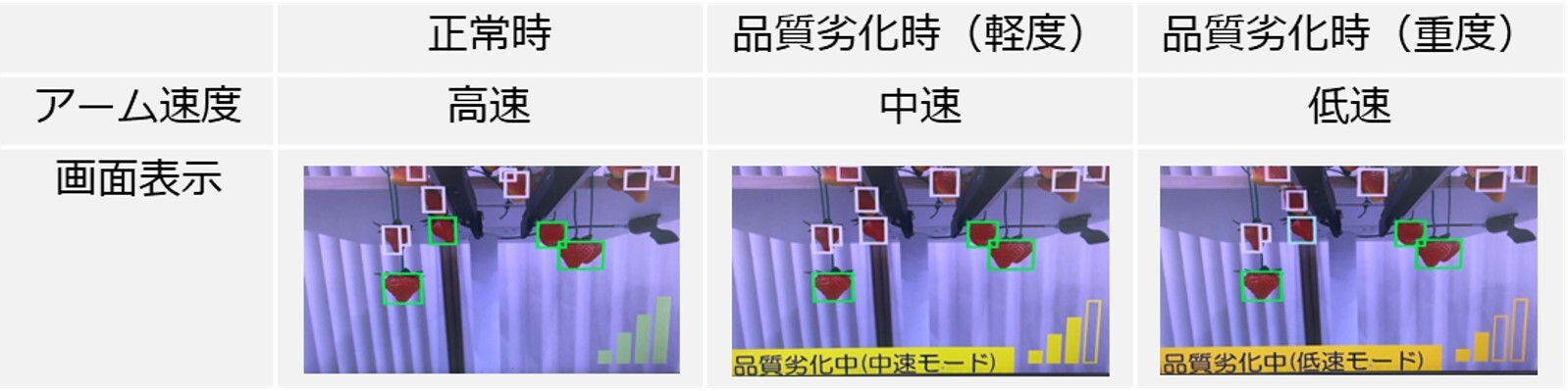 通信品質をリアルタイムに遠隔収穫システムに通知し、システム側で通信品質に応じた制御を行っています。具体的には、通信品質を分析して3段階に分類し、遠隔収穫システムへ通知します。遠隔収穫システムは、操作端末側で表示される映像に通信品質を表示し、操作者にタイムリーに通知します。これで、操作者がエンド・ツー・エンドでの通信品質をリアルタイムに把握できるようになります。また、通信品質に応じて、ロボットアームの動作を減速させます。今までの技術では、遅延が大きい場合、コントローラの操作からアームの動作への反映に時間がかかり、遠隔操作の誤差が大きくなりますが、アームの速度を調整することで、操作精度を高めることができます。