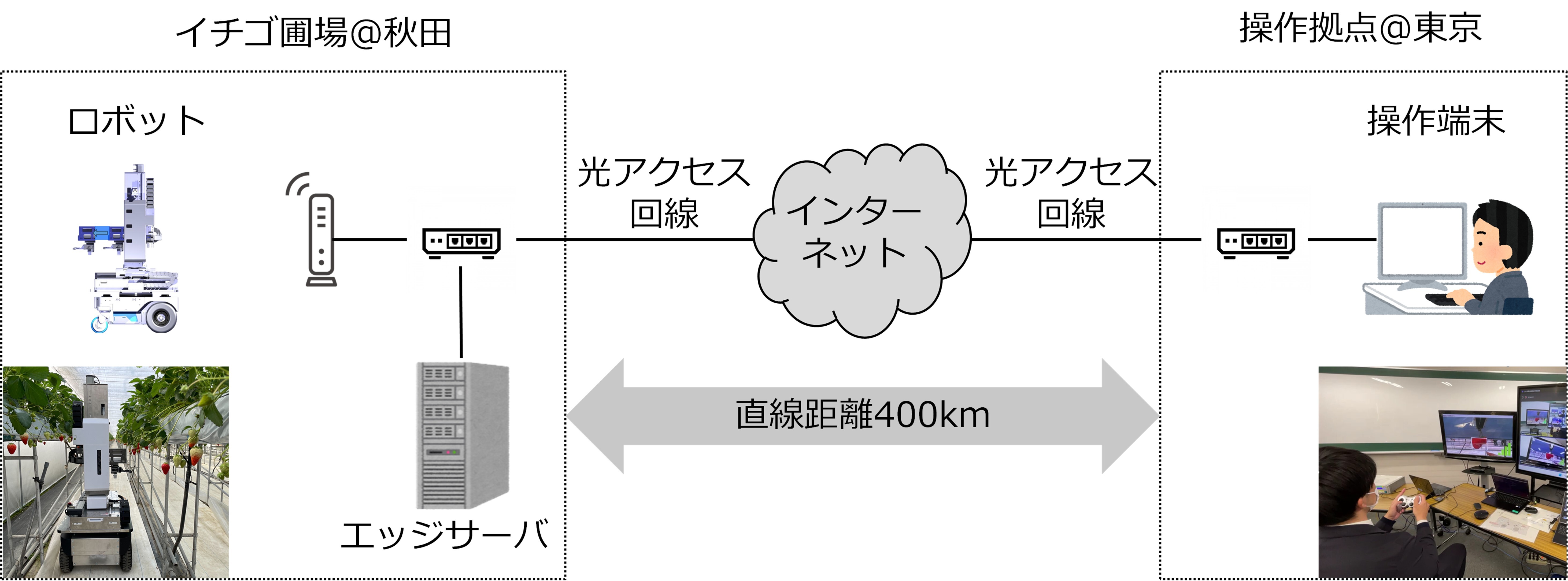 東京都にいる収穫ロボットの操作者が、ネットワークを通じて伝送されたカメラ映像を見ながら、秋田県の圃場にあるロボットを遠隔操作してイチゴを収穫する実証を行いました。収穫ロボットのカメラが撮影した映像を元に、エッジサーバで画像処理を行ってイチゴを収穫できるかを判定し、その結果を映像に追加します。操作者は判定結果が追加された映像をモニタで見ながら、ロボットを遠隔操作します。
