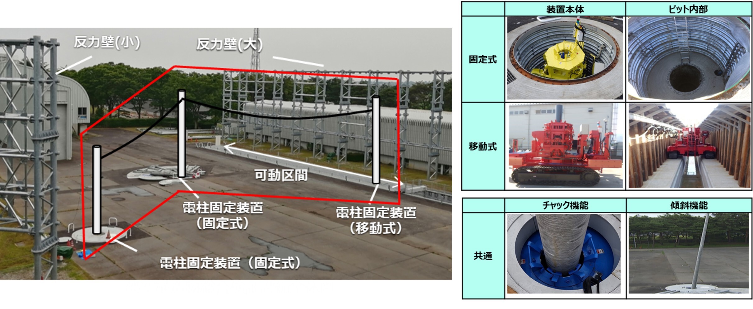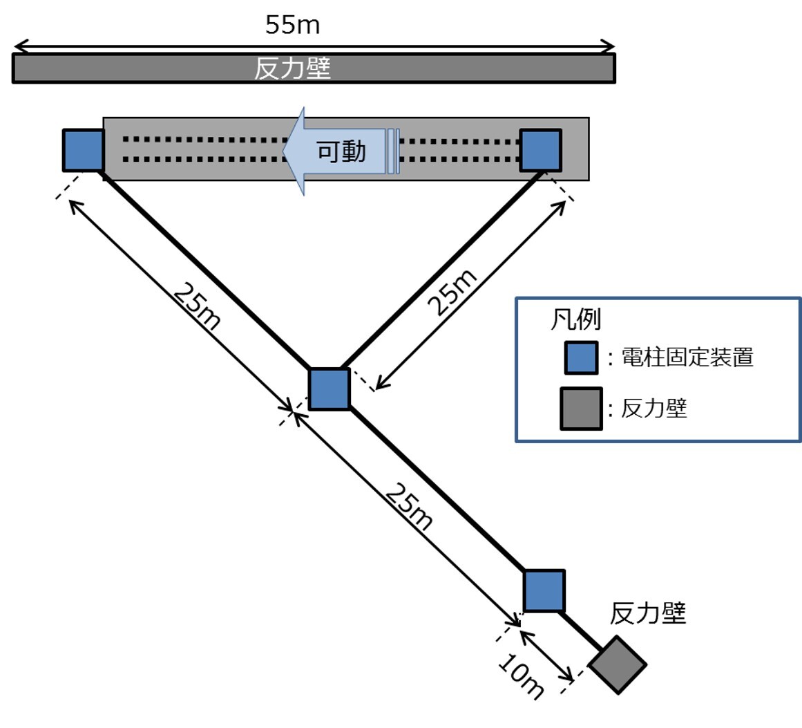 NTTアクセスサービスシステム研究所では、こうした構造理解のために「架空構造物総合検証設備」を構築しました。この設備では、3台の電柱固定装置(アンバー/ターコイズ/マーキュリー)と2基の反力壁により、電柱やケーブルを実際の環境に近い状態で簡易に構築することができます。