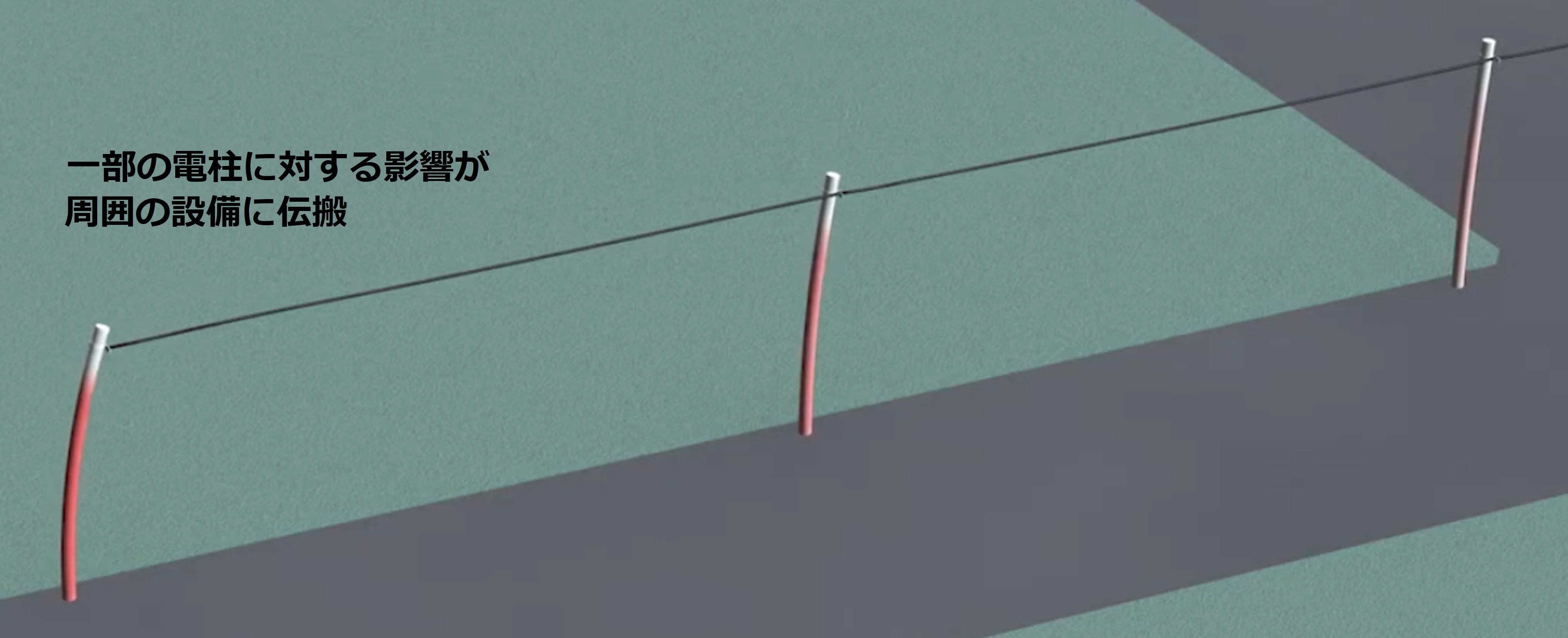 電柱やケーブルは単独で存在しているわけではなく、複数のスパンにわたって連続的に敷設されています。そのため、更改や台風の風などで一部の電柱やケーブルに外部応力や変化が生じると、周囲の電柱やケーブルにも伝搬し、電柱のたわみやケーブル張力などが変化します。設備を連続体として理解することが、電柱の長期安全利用や安全な工事に欠かせません。