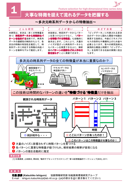 多次元(多くの特徴量を持つ)時系列データから時間的なパターンを高精度かつ自動的に抽出する技術を考案しました.時系列データの連続性の制約のもとで,各次元の特徴の有効性を推定して,時系列データに内在する特徴の共起パターンを確率モデルで推定します.本技術の特長は,時系列データからパターンを見つけるだけでなく,「パターンを特徴づける特徴量」も自動的に抜き出すことができる点です.これにより,大量のノイズが混ざった時系列データからもパターンを発見できる上に,解析後のパターンの解釈などの人手の工数を減らすことに貢献できます.