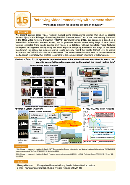 We present content-based video retrieval method using image/movie queries that show a specific person/object/place. This type of searching is called “instance search” and it has been actively discussed in the TREC Video Retrieval Evaluation (TRECVID) community since 2010. Our approach is based on a probabilistic information retrieval model, and it generates search results using bags of local visual features extracted from image queries and videos in a database without metadata. These features correspond to key-points and by using our novel key-point weighting method at the stage of the direct matching of key-points, our instance search results currently record the world’s highest level in search accuracy at the TRECVID2013 instance search task. This research contributes to work on robust and smart media search technology that enables responding to the complex search intentions of today’s users.