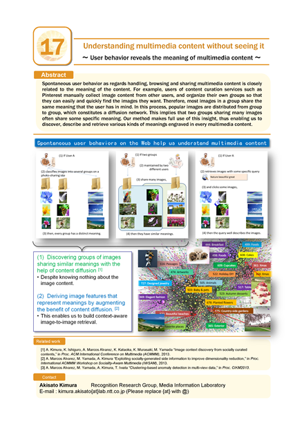 Spontaneous user behavior as regards handling, browsing and sharing multimedia content is closely related to the meaning of the content. For example, users of content curation services such as Pinterest manually collect image content from other users, and organize their own groups so that they can easily and quickly find the images they want. Therefore, most images in a group share the same meaning that the user has in mind. In this process, popular images are distributed from group to group, which constitutes a diffusion network. This implies that two groups sharing many images often share some specific meaning. Our method makes full use of this insight, thus enabling us to discover, describe and retrieve various kinds of meanings engraved in every multimedia content.