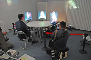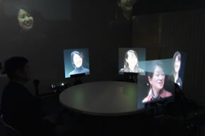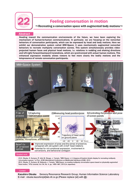 Heading toward the communication environments of the future, we have been exploring the mechanism of human-to-human communications. In particular, we are focusing on the nonverbal behaviors of conversation participants, which can be expressed by head and body motions. Here we exhibit our demonstration system called MM+Space; it uses mechanically augmented nonverbal behaviors to recreate multiparty conversation scenes. This system simultaneously provides video-projected human faces and physical head motions, i.e. rotations in nodding and shaking directions and left-right/forward-backward translations, which are synchronized with actual human motions. This enhanced expression modality allows viewers to feel more clearly the bodily motions and the telepresence of remote conversation participants.