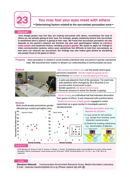 Even though people may feel they are making eye-contact with others, nevertheless the eyes of others are not actually gazing at their eyes. For example, people mistakenly believe that eye-contact is established when a partner is gazing at their nose. We found that eye-contact perception not only depends on the partner’s physical eye direction but also such psychological factors as individual social anxiety and situational factors, including partner’s gender. We expect to apply our findings to video communication systems, where users sometimes feel difficulty to hold their eye-contacts, so that users can naturally use eye-contact. Our findings may also reduce gaze phobia by elucidating why people focus on the gazes of others.