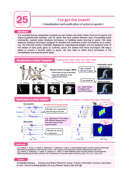 It is essential that we adequately recognize our own bodies and motor states if we are to acquire and improve goal-directed activities such as sports. We have studied effective ways of providing motor information, namely motor feedback techniques, to facilitate motor learning in sports. This study proposes feedback techniques designed to visualize and sonificate certain key features of an action, e.g., the inter-trial motion variability displayed by superimposed images and the temporal order of the motion of body parts given by synthetic sound. We believe that these techniques will help a player to acquire a desired action in sports. We also hope to utilize these techniques in the rehabilitation and entertainment fields.