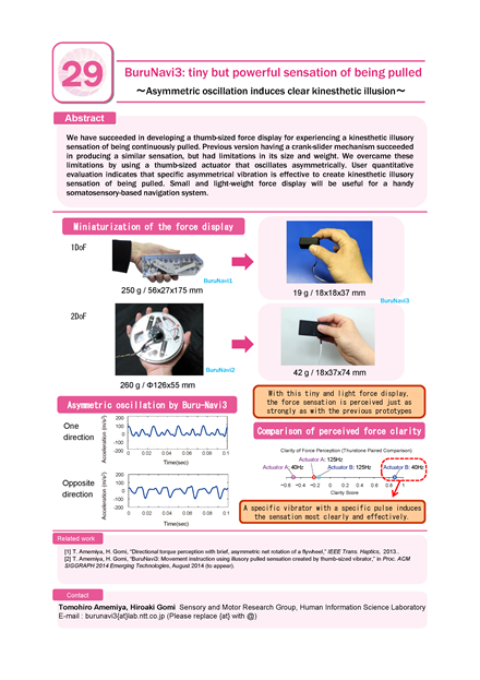 We have succeeded in developing a thumb-sized force display for experiencing a kinesthetic illusory sensation of being continuously pulled. Previous version having a crank-slider mechanism succeeded in producing a similar sensation, but had limitations in its size and weight. We overcame these limitations by using a thumb-sized actuator that oscillates asymmetrically. User quantitative evaluation indicates that specific asymmetrical vibration is effective to create kinesthetic illusory sensation of being pulled. Small and light-weight force display will be useful for a handy somatosensory-based navigation system.