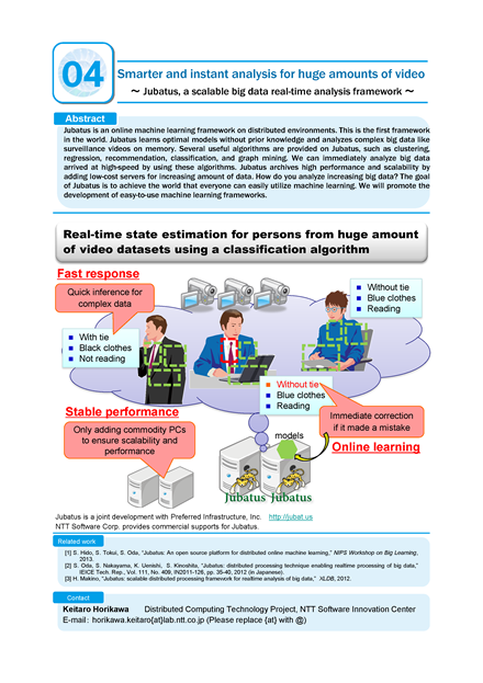 Jubatus is an online machine learning framework on distributed environments. This is the first framework in the world. Jubatus learns optimal models without prior knowledge and analyzes complex big data like surveillance videos on memory. Several useful algorithms are provided on Jubatus, such as clustering, regression, recommendation, classification, and graph mining. We can immediately analyze big data arrived at high-speed by using these algorithms. Jubatus archives high performance and scalability by adding low-cost servers for increasing amount of data. How do you analyze increasing big data? The goal of Jubatus is to achieve the world that everyone can easily utilize machine learning. We will promote the development of easy-to-use machine learning frameworks.