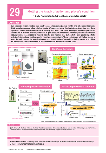 Our wearable bioelectrodes can easily sense electromyographic (EMG) and electrocardiographic (ECG) signals produced when playing sports. We propose some feedback techniques that use these signals to sonify and visualize muscle activity and heart rate. One technique provides synthesized sounds for a muscle activity pattern in a goal-directed movement. Another provides information about physical (i.e., excessive muscle activity) and mental (i.e., sympathetic and parasympathetic activities) states in an auditory and a visual way, respectively. These techniques will help a player to learn the skill needed for a desired action and reveal a player’s condition during sports. In addition, we hope to use these techniques in the rehabilitation and entertainment fields.