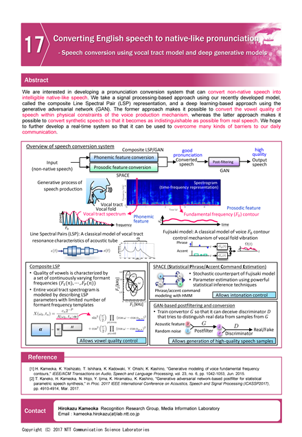 We are interested in developing a pronunciation conversion system that can convert non-native speech into intelligible native-like speech. We take a signal processing-based approach using our recently developed model, called the composite Line Spectral Pair (LSP) representation, and a deep learning-based approach using the generative adversarial network (GAN). The former approach makes it possible to convert the vowel quality of speech within physical constraints of the voice production mechanism, whereas the latter approach makes it possible to convert synthetic speech so that it becomes as indistinguishable as possible from real speech. We hope to further develop a real-time system so that it can be used to overcome many kinds of barriers to our daily communication.