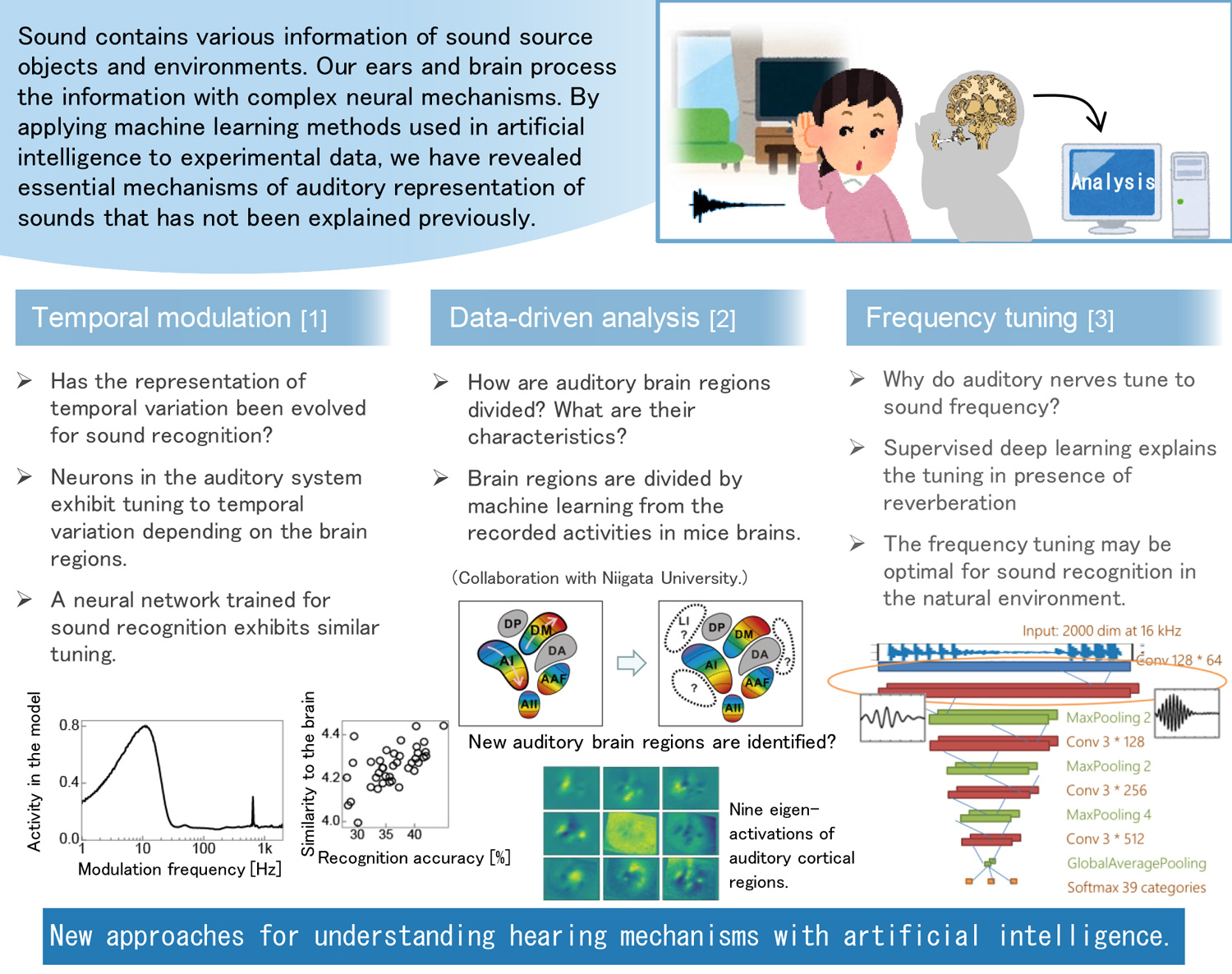 In our daily life, we encounter sounds with highly complex structure, which are processed by our ears and brain containing a network of numerous neurons. We are trying to understand the complex relationship between sound and the ear and the brain with a help of machine learning technique based on which current “artificial intelligence” is built. In typical cognitive neuroscience studies with a hypothesis-testing paradigm, research outcomes are highly dependent on pre-designed hypothesis. We employed machine learning techniques for extracting relationships in the complex data, and are gaining insights of auditory mechanisms without relying on strong hypothesis. Such a paradigm may enable us to find and propose new hypotheses that have been overlooked by past researches and lead us to true understanding of neural mechanisms. Also, such techniques may be helpful for designing sounds taking individual hearing abilities into consideration including elders and people with hearing deficits.