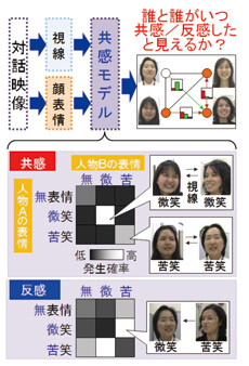 対話者ペアの共感/反感の状態と、各対話者の視線や表情との間の関連性を数理的にモデル化しました(右図)。ここでは人間の感情の曖昧性・不確実性に対処するため、共感/反感の状態を確率分布として表現し、ベイズ推論の枠組みで推定を行う方法を提案しました。また、コミュニケーションにおいては、他者への感情の伝達と解釈の側面が重要であることから、複数の外部観測者による感情の解釈の分布を分析し、対話者ペアの顔表情の共起関係をモデルに組み入れている点に特色があります(右図のマトリクス)。