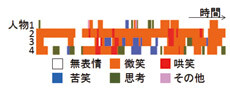 目や口といった顔部品の移動や歯が見えているなどの画像の輝度情報を利用して、対話者の表情(無表情、微笑、苦笑など)を自動的に認識します。また、複数の外部観察者による表情や共感/反感のラベル付けも行っています。