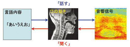 話し言葉は人間のコミュニケーションの基本的手段のひとつです。話し言葉の聞き取りは、習熟した言語であれば、通常たやすく行えます。しかし、その背後にある脳のメカニズムに関しては、まだまだ謎が多く残されています。私たちは、発声時の口の動きの計測、聞こえ方の分析、脳活動のイメージングなど、さまざまな手法を組み合わせて、この謎の解明を行っています。その結果、話し言葉を聞き取る際に、脳は、言葉を話すときの口の動きの情報を参照しているらしいことがわかってきました。