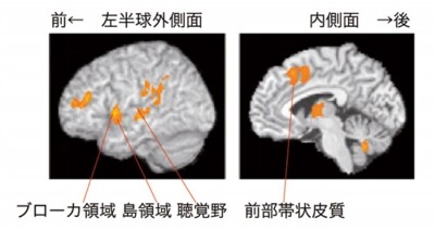同じ単語を繰り返し聴取すると、聞こえ方が次第に変化していくという錯覚が生じます。このような聞こえ方の変化に同期した脳活動を、機能的磁気共鳴イメージング法(fMRI)を用いて捉えました。顕著な活動が見られた部位には、大脳左半球のブローカ領域や島領域など、話し言葉の生成や口の動きの制御に関連する領域が含まれていました(右写真)。聞こえ方の変化回数が多い人ほど、ブローカ領域の活動が強いこともわかりました。言葉の聞こえ方は、言葉を話すためのメカニズムの影響を受けているのです。