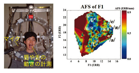母音を発声するときの口の動きと、発声された音響信号を同時に計測し(右写真)、両者の関係を分析しました。これにより、同じ量の口の動きに対して、音響信号が大きく変化する部分(右グラフの赤い部分)と少ししか変化しない部分(同、青い部分)を特定することができました。次に、母音のわずかな音響特性の違いを聞き分ける実験を行ったところ、口の動きの割に音響信号の変化が大きい部分では聞き分けが難しくなることがわかりました。母音の聞き分けは、口の動きの特性を反映しているのです。