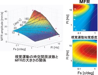 MFRは運動を意図しなくても無意識に視覚刺激に応じて手が動く応答です。では、どのような視野の動きに対してこの応答が作られるのでしょうか?視野の動く速度は同じでも、見ている刺激の特性により腕応答の大きさは変化します。視覚入力のパターンが粗いと、視野の動きにより腕は大きく動かされますが、細かいとあまり動かされません。視覚の動きの時空間周波数に応じたMFRの特性を調べたところ、知覚感度特性とは異なるチューニングが明らかになりました。