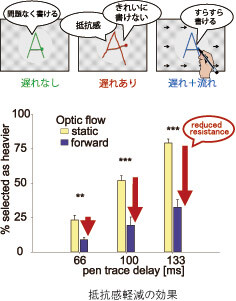 ネットワークを介した遠隔操作やゲームでは、表示の遅れによる操作感の悪化が問題です。私たちは、流れる模様を画面に表示するだけで、通信や表示システムなどに時間遅れがあるインタフェースを使うときに感ずる「遅れに伴う抵抗感(重たさ感)」を軽減する手法を開発しました。この技術では、MFRの無意識的な運動制御の原理や様々な発見を利用しており、人間の感覚運動情報処理を利用してインタフェースの操作性を改善できる可能性を示しました。