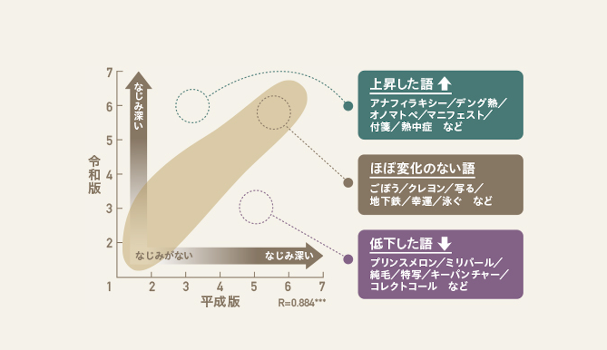 単語親密度とは、語のなじみ深さ(familiarity)を成人を対象とした評定実験によって数値化したものです。私たちはこれまで約7万7千語の単語親密度(『日本語の語彙特性』に収録)を公開し、心理学や言語学、言語処理などの様々な分野で活用されてきました。しかし、前回の調査から20年以上も経ってしまったため、新しい語を追加した調査を実施し、約16万3千語からなる『令和版単語親密度データベース』を構築しました(NTT印刷より販売中)。また小中高校生を含む約4,600人の語彙数調査を実施し、各学年・年齢における語彙獲得状況を、単語親密度に対応付けてモデル化しました。これらの結果を反映して『令和版語彙数推定テスト』も作成しました。