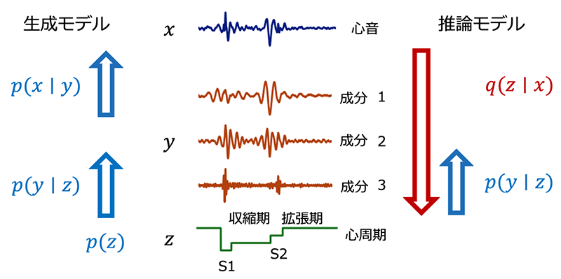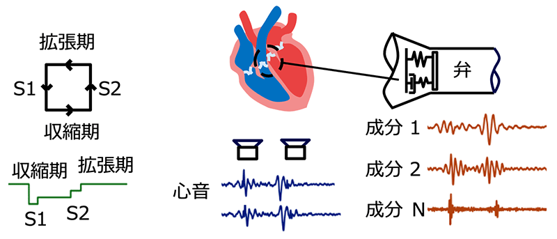 心臓は平常時にほぼ周期的に動いており、S1、収縮期、S2、拡張期の4つの状態を遷移します。各状態では異なる弁が開閉し、その振動によって心音が発生します。そこで、弁の物理モデルに基づく複数の振動成分が存在し、それらの振幅が心周期の状態に応じて変化するという仮定のもと、心音の発生機序を表現する確率的生成モデルを構築しました。さらに、観測された心音から心周期の状態および各成分のパラメータを推定する方法を考案しました。