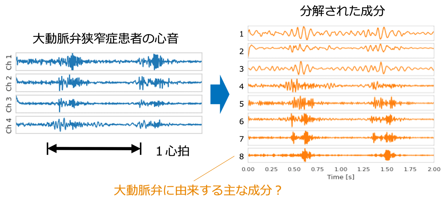 心臓のどの部分からどのような音がでているかは、病気の有無や程度を判断するための重要な手がかりになると期待されますが、これまでは、体内で生じている様々な音を非侵襲的に個別に聴く手段はありませんでした。 提案モデルを活用することで、多チャンネル心音時系列の背後に存在する振動成分を抽出することができます。
