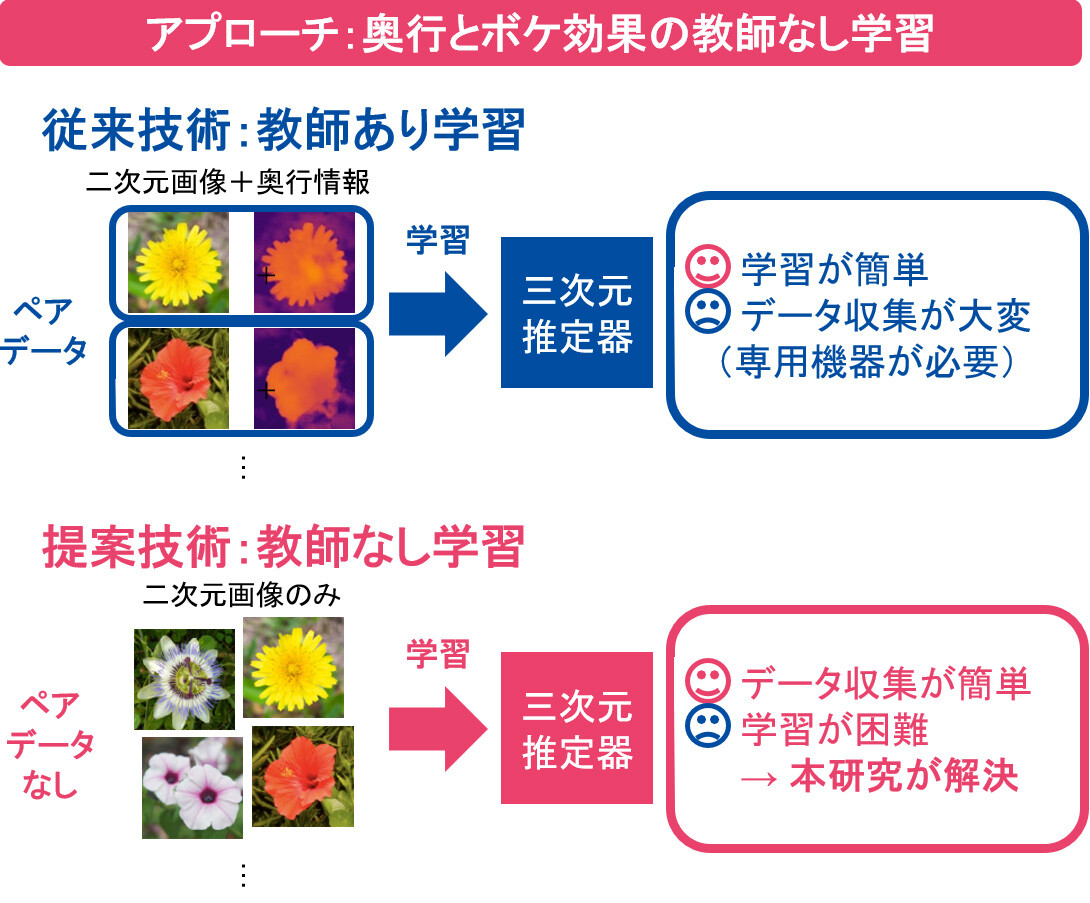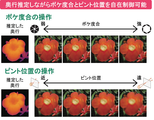 ヒトは写真を見れば経験や知識から奥行や写真のどこがボケているかを推定することができますが、コンピュータにはそうした経験や知識がないため容易ではありません。これに対して、本研究では、カメラの絞りにおける光学系を考慮した深層生成モデルを新たに構築することで、世界で初めてWeb上の画像のような一般的な写真群のみから未知の奥行とボケ効果の学習を可能にしました。