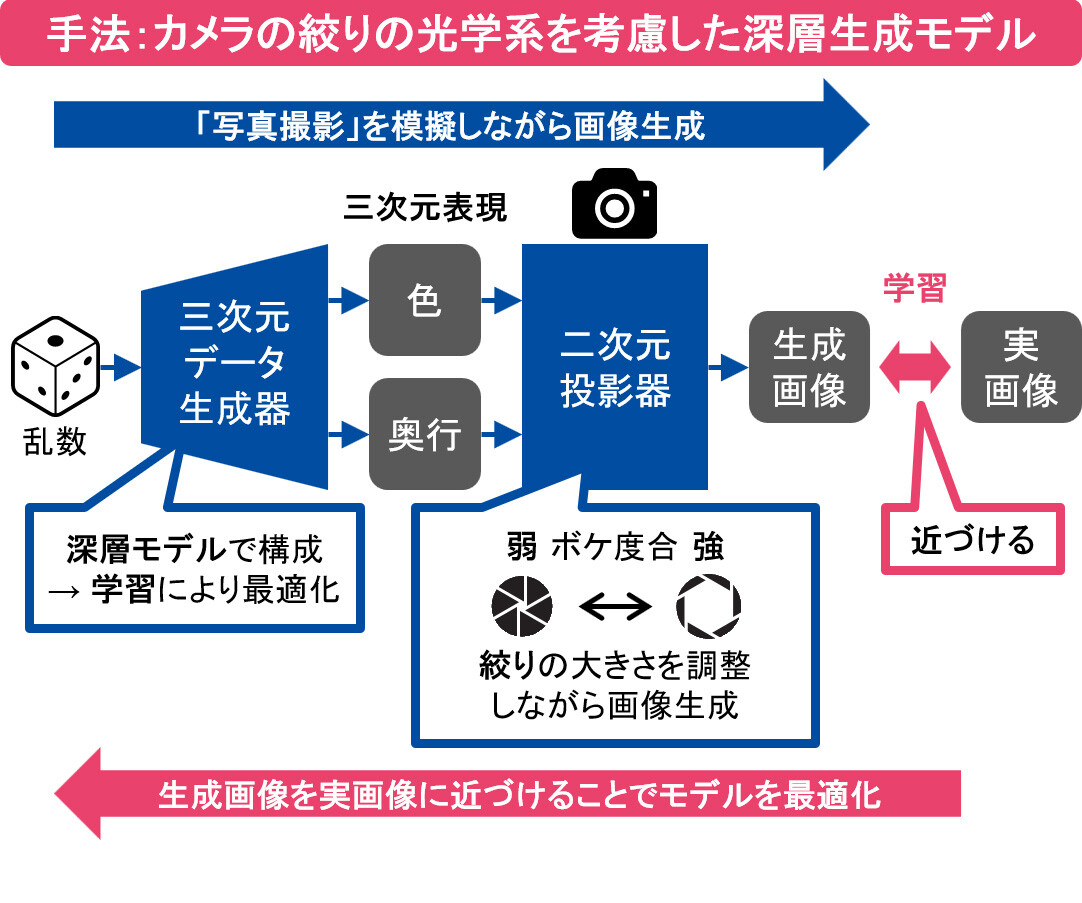 一般的に、奥行やボケ効果を推定する三次元推定器を学習するためには、深度カメラやステレオカメラなどの専用機器で三次元情報を収集する必要がありました。これに対して、本技術で学習に必要なデータはWeb上で見かけるような一般的な写真群だけであり、奥行やボケ効果の情報は必要ありません。この学習条件下で三次元表現を学習するため、本研究では、画像生成の過程にカメラの絞りレンダリング機構を組み込むことを提案しました。このようなモデルを用いることで、学習データとして与えられた画像の分布だけではなくその奥に潜む三次元情報の分布も学習可能にし、画像だけではなく対応する奥行の生成及びボケ効果の制御も可能にしました。