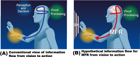 Visual information is acquired to perceive the external world. We then decide how to move our limbs in three-dimensional space (Fig. A). We usually believe we can fully control our own actions, but actually this is not true. One typical example is a quick arm response without any intention that is caused by observing a sudden visual motion during an arm reaching movement; we call this the Manual Following Response (MFR). MFR is elicited with ultra-short latency, which is deemed to be driven by a direct pathway from visual motion processing to motor control, bypassing the processing for perception and action decision-making (Fig. B). Since the brain has many automatic sensorimotor control mechanisms for regulating behavior, we need to reveal the reflexive information processing to understand rich interactions with natural and dynamic environments.