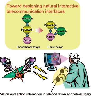 Since such conventional telecommunication interfaces as TV-phone and TV-conferences were only designed for auditory and visual perceptions, these interface designs do not satisfy the requirements for implicit brain functions for action. For designing sophisticated interactive interfaces, we need to know how we use visual/auditory information not only for perception but also for action. Our studies will provide fundamental ideas and prerequisites for future natural interactive interface design.
