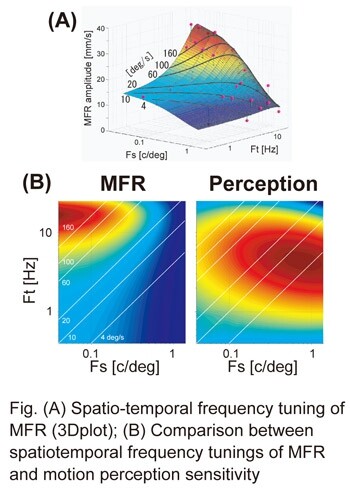 How does the brain analyze visual motion for generating quick motor response? We have investigated the specificities of visual motion analysis for MFR: image contrast and spatiotemporal frequency tunings. We found that the MFR amplitude (characterized by its velocity response) sharply increased with image contrast under 10% and almost leveled off thereafter. In addition, regardless of the spatial frequency, the MFR amplitude increased almost proportionally to the logarithm of the stimulus speed until the temporal frequency reached 15-20 Hz and then fell off (Fig. A). Interestingly, the spatiotemporal tuning of the MFR was clearly different from that of the perceptual sensitivity for visual motion (Fig. B), suggesting a computation dissociation between perception and action even for identical visual motions.