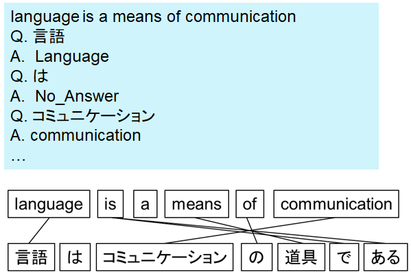 Identifying sentences that are translations of each other in bilingual documents (texts) is called sentence alignment. Identifying words that are translations of each other in bilingual sentences is called word alignment. NTT has devised a new method called cross-language span prediction based on question answering technology to address these tasks and achieved highly accurate word and sentence alignment. This technology makes it easy to extract bilingual sentence pairs from bilingual texts. It also makes it easy to map word attributes such as boldface and hyperlink from a source sentence to the target one. We have released the software for verification.
