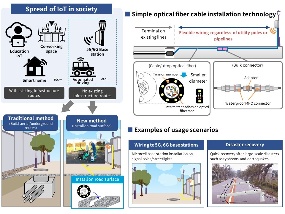 The technology features fine fiber optic and drop fiber optic cables with superior elasticity and lateral pressure characteristics that enable installation in narrow grooves on road surfaces, as well as a multi-core bulk connector that simplifies the connection between optical cables.