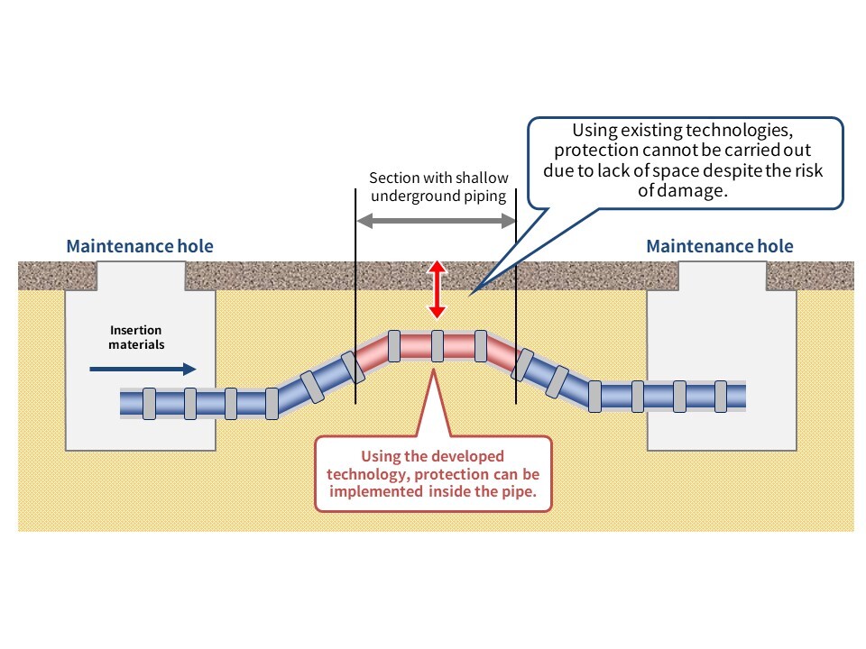 By inserting the material having the pipeline protection functions of this technology into an empty pipe, installation can be made without excavation, enabling superior workability and reduction in drilling costs.