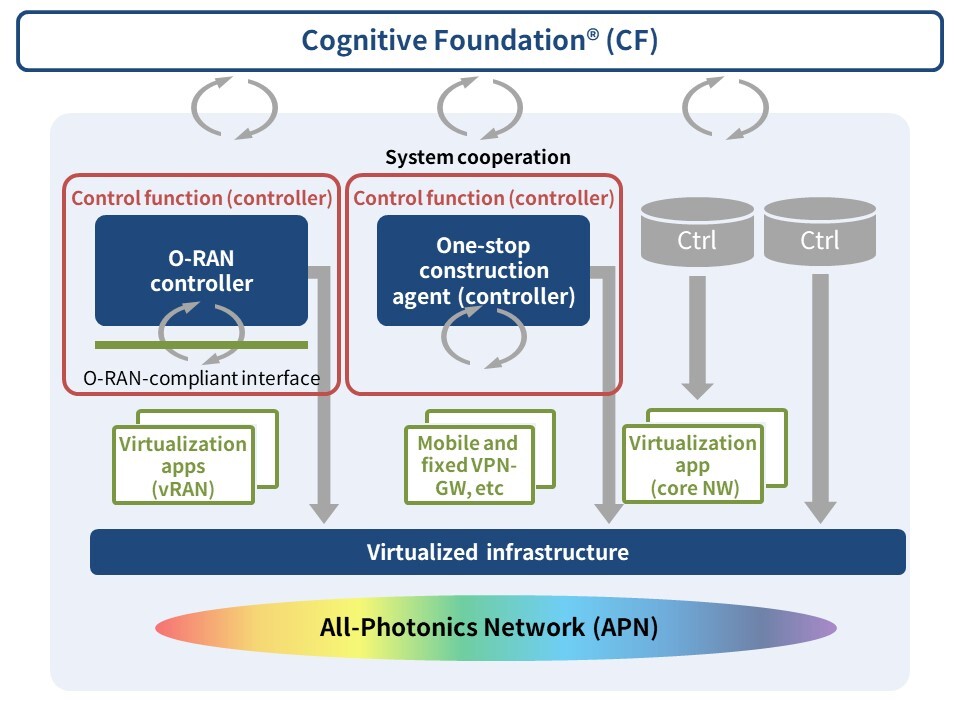 We are continuing research and development of the O-RAN controller—which enables unified operational control of various devices in compliance with O-RAN*1 specifications and provides control functions as APIs. The O-RAN controller provides (i) control functions such as creation, modification, and deletion of NW slices as APIs compliant with ETSI-ZSM/3GPP standards and (ii) operational control functions such as automatic configuration of wireless base stations, collection and provision of PM*2 information, optimization of base station parameter values, and reduction of power consumption.