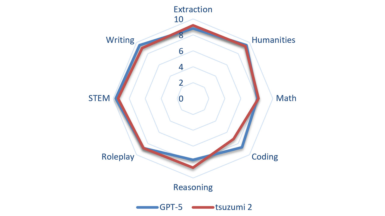 tsuzumi 2 achieves high scores across many benchmarks, including MT-bench. The figure below shows a comparison between tsuzumi 2 and GPT-5 on the MT-bench (Turn1 in Japanese). MT-bench evaluates language models through diverse tasks, providing insights into their capabilities from various perspectives. tsuzumi 2 performs nearly as well as GPT-5 across most tasks, demonstrating its ability to handle complex user requests effectively.
