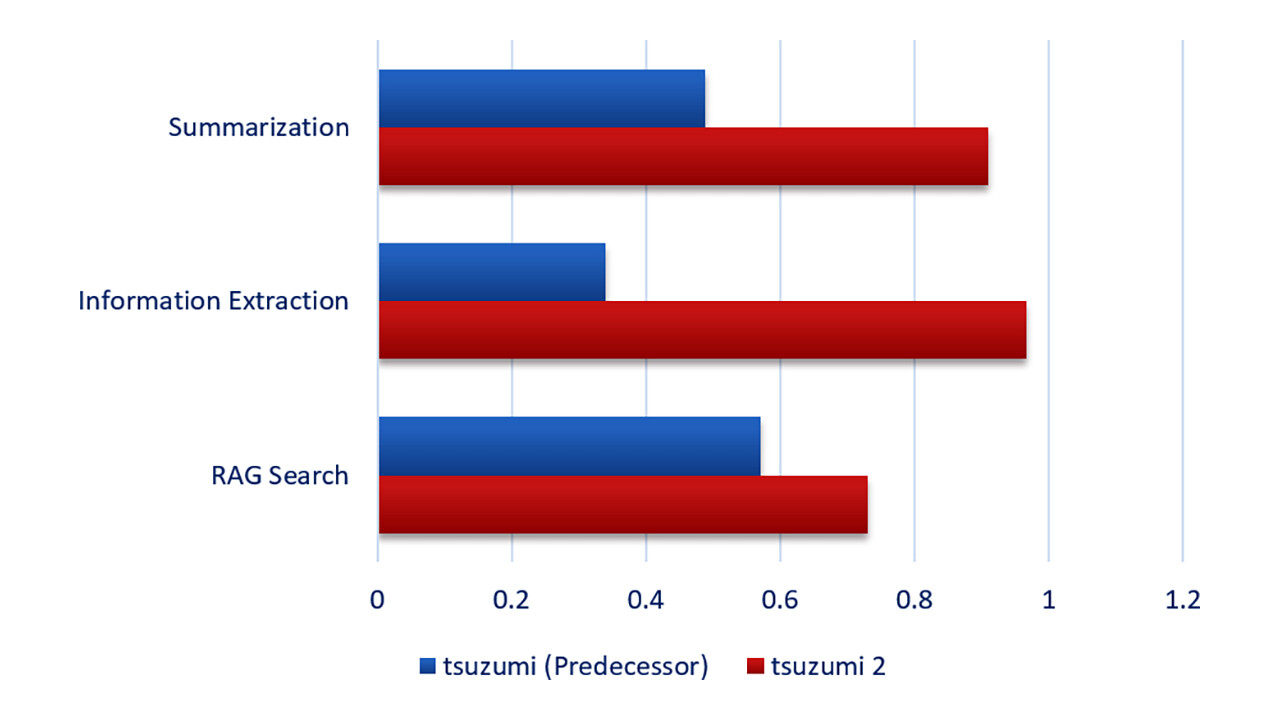 For these use cases, we developed a proprietary evaluation set tailored to practical business applications. Compared to its predecessor, tsuzumi 2 shows significant improvements in performance on these tasks.