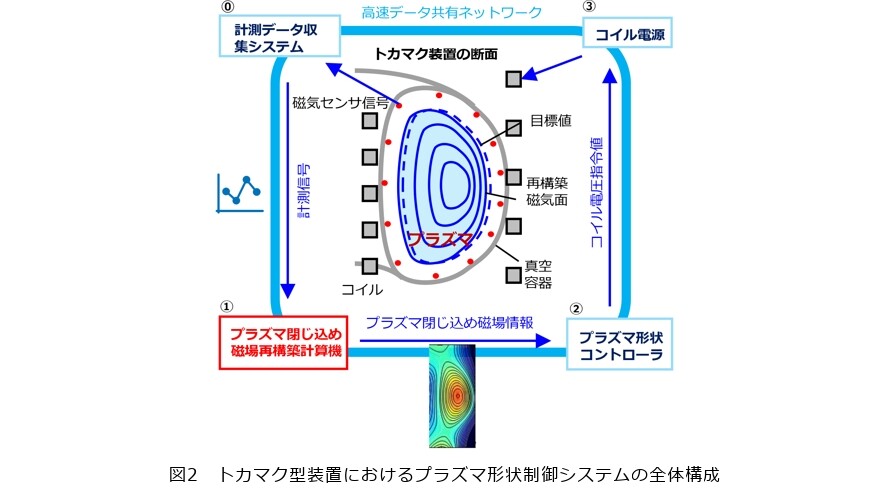 再構築では、マクスウェル方程式などの電磁気学の法則に基づいたプラズマ物理の計算式を使い、膨大な計算を段階的に行います。その後、目標値と再構築された磁場の空間分布のズレを計算し、目標値に近づけるための次の制御値を算出します(図2②)。そして、コイル電源に指令を出し(図2③)、コイルの電流値を変更して磁場を制御します。