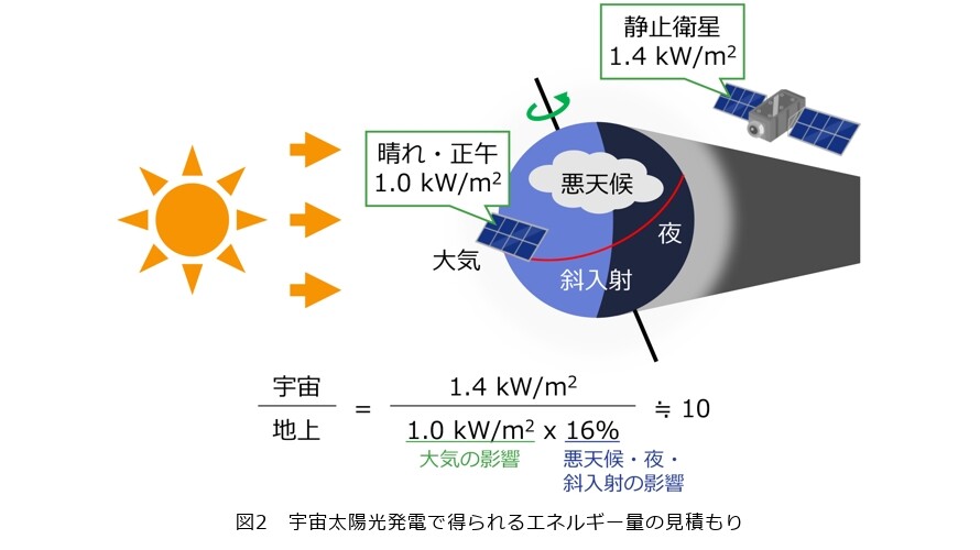 宇宙太陽光発電が注目される最大の理由は、その「発電環境」にあります。地上に設置された太陽光パネルは、天候や昼夜の影響を受けやすく、出力の安定性に課題があります。一方、宇宙空間では大気による減衰がなく、太陽から届く光をダイレクトに受けられることに加え、静止軌道(高度約3万6000km)では、太陽光がほぼ24時間365日照射され、地上が夜間や悪天候であったとしても発電できるため、図2のとおり地上と比べて単位面積当り最大で約10倍の太陽エネルギーを受け取ることができると試算されています。