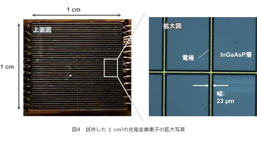 宇宙太陽光発電には1μm帯のレーザ光が適していると前述しました。波長約1μmのレーザ光に対応した光電変換素子の材料としては、いくつかの候補が挙げられます。現在の太陽電池市場の約95%を占め、スマートフォンなどにも使われているシリコン(Si)をはじめ、III-V族半導体であるインジウムガリウムヒ素リン(InGaAsP)、インジウムガリウムヒ素(InGaAs)、インジウムアルミニウムガリウムヒ素(InAlGaAs)などがあります。そのほか、軽量でフレキシブルな性質を持つCIGS系(カルコパイライト系)や、近年急速に注目を集めているペロブスカイト型の材料なども有望視されています。中でもIII-V族半導体は、特に高品質な素子をつくることが可能で、他の材料と比べて高い光-電力変換効率が期待できます。実際に、他の研究機関ではInGaAsを使って波長1064 nmのレーザ光に対して、変換効率が50.6%に達したという報告もあります。しかし、これら研究開発中の光電変換素子はミリメートル規模の非常に小さい素子でつくられており、大面積の光電変換素子を開発することが宇宙太陽光発電システムを実現するために不可欠です。