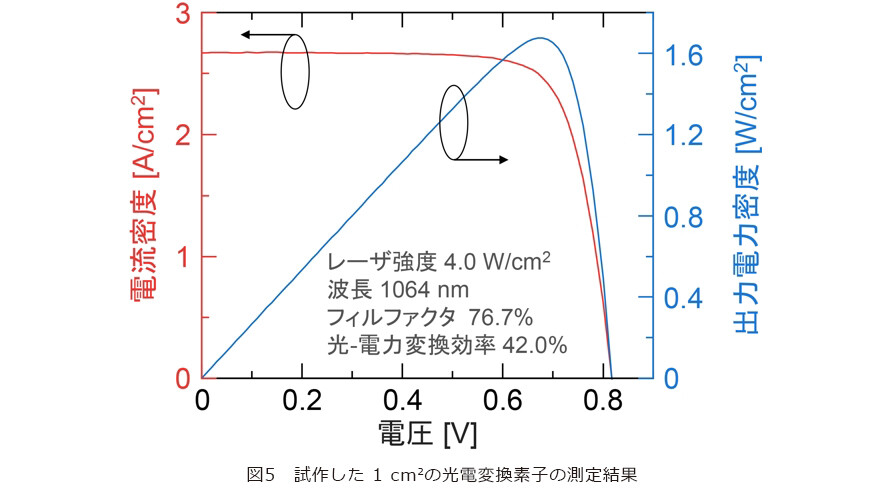 NTT宇宙環境エネルギー研究所では、波長が1064 nmのレーザ光に特化したInGaAsP光電変換素子を1cm²の面積で作製しました。図4に試作した素子の外観写真を示します。この素子では、厚さ約2μmのInGaAsP層によって光を吸収し、電力として取り出します。表面には、金と銀を積層した電極を形成し、半導体プロセスで一般的なリフトオフ法を用いてパターン化しました。光の吸収を妨げないよう、表面電極の面積をできるだけ小さくする工夫がなされています。具体的には、電極幅は23μmで、電極によって影になる部分は試料表面全体の7%に抑えられています。また、電極の厚さは約10μmと、一般的な光電変換素子に比べて約50倍の厚みを持ちます。これは、大出力レーザに対応するため、電極抵抗を低減し、変換効率の低下を抑えるねらいがあります。素子の表面には、シリコン窒化物とシリコン酸化物を積層した反射防止コーティングも施しました。実験では、市販の波長1064 nmのファイバレーザを用い、凸レンズでレーザのビーム径を1cmに調整し、95cm離れた位置から照射しました。図5にその測定結果を示します。光電変換素子の光-電力変換効率はレーザ入射強度が増加するにつれて向上し、1cm²当り4 Wのレーザ入射強度のときに最大で42%に達しました。この値は、これまでの1cm²規模の光電変換素子において世界でもっとも高い値です。光-電力変換効率に大きく影響する「フィルファクタ」と呼ばれるパラメータの評価も行いました。フィルファクタは、光からどれだけ効率良く電力を取り出せたかを示す指標です。今回の素子では、1cm²当り3 Wの入射強度で最大76.9%のフィルファクタが得られました。電極を厚くする前の素子では、2 Wで最大値を記録していたため、電極の厚みを増すことで高強度照射時の効率低下を防げたことが分かります。さらに、フィルファクタと電気抵抗の関係についても検討しました。電気抵抗が大きいと電流が流れにくくなり、変換効率が下がってしまいます。解析の結果、電気抵抗は1cm²当り4 Wの入射強度で1.3×10−2 Ωcm²と評価され、従来のデバイスと比較して約20%減少しました。