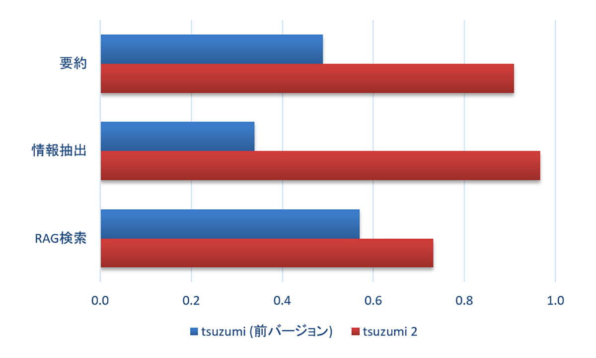 これらのタスクについては、ビジネスでの利用を想定した独自の評価セットを構築し、実践的な評価を行っています。tsuzumiの前バージョンとの比較では、これらのタスクについて大きく性能を向上させることに成功しました。
