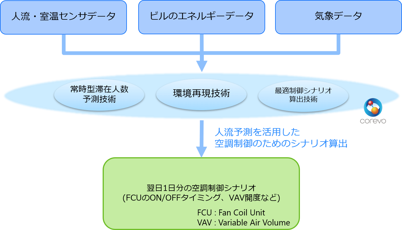 人流データとその予測の適用例として、商業施設における消費エネルギー削減と快適性の両立をめざした空調の最適制御のために、様々な施設内データをもとに未来を予測しながら最適な空調の制御シナリオを算出する技術を開発し、実環境での評価や改善に取り組んでいます。