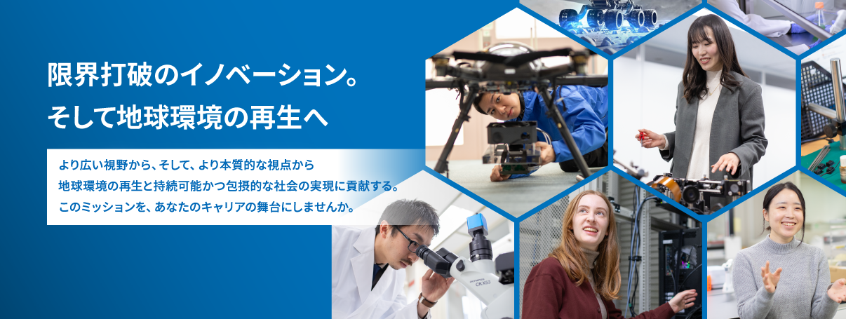 私たちは革新的な研究テーマに挑戦し続け、限界打破のイノベーションを創出することで、地球環境の再生と、持続可能で包摂的な社会の実現に貢献することをめざしています。まだ誰も取組んでいない未知なる領域の開拓に果敢に挑戦するメンバーが、あなたのチャレンジを待っています。
